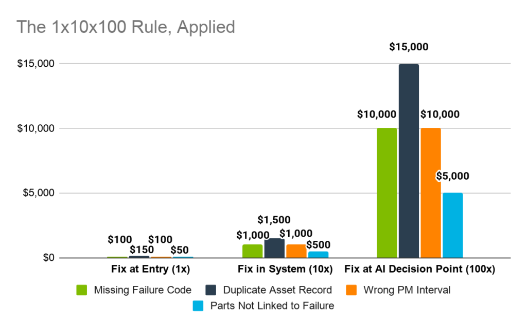 AI maintenance data accuracy depends entirely on the quality, consistency, and structure of the historical maintenance information fed into predictive models. Catching these problems early on is especially important. Labovitz and Chang’s 1x10x100 rule tells us that fixing a data quality issue at the point of entry may be costly or time-consuming, but correcting the same issue once it’s propagated undetected in the system costs 10x that amount, on average. If left until the decision-making stage, that amount skyrockets to 100x.